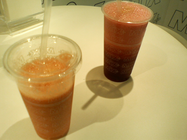 最近出来た駅ビルの中のドリンクバー 自然のものだけを使った野菜や果物のミックスジュースのみを取り扱う健康的なお店です 手前はストロベリーミックス 一番甘いやつだけど中にはコラーゲンが追加で入っております(▼∀▼) 奥はワインビネガーミックス 黒酢が約半分入っててかなり酸っぱい! 必ず駅ビルの地下に行くと飲むようになりました(*´∇`*)