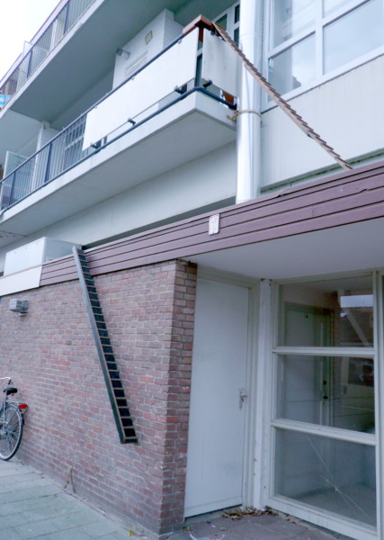 じゃ、それではなぜ下までこの階段をおろさなかったのだろうか。 もちろん、この高さままで猫が飛び上がれるからそこから下はつける必要がない、といえばそうだが何か他にもそのような理由があるのではないかと考えた。 ビルの非常階段がある。大抵が下まであるが中には丁度大人が立って胸の辺りから垂直な階段が始まっているところがあるし、また手を伸ばして頭の上ほどのところにある梯子を何かのフックを外して下に梯子を引っ張り下ろす仕組みのものもある。 そのようなものは完全に梯子が下までついていないからこれもそれと同じ態なのだろ。 つまりそこまで必要ない、という考えた方だ。