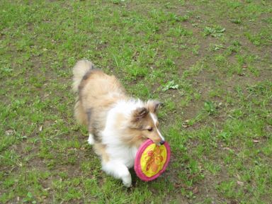 フリスビー・レトリーブ中。 でも落ちたフリスビーのレトリーブしかできないのだ。 たまに道草を喰って持ってこないこともある 空中キャッチへの道は遠い・・・