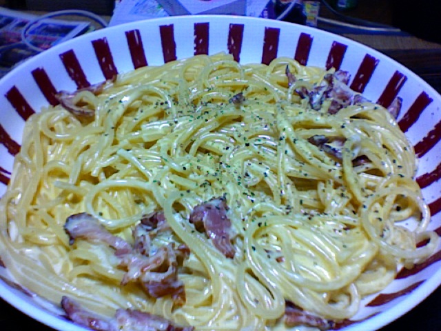 夜にお腹が空いてしまって。冷蔵庫を見るとおいしいそうなパルミジャーノチーズが!!そして生クリームもあるじゃないですかっ!! これはカルボナーラを作るしかないと! 作ってみました!!