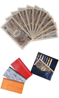 とのことで確かにこのケース、紙製ながらよく出来ている。一見すると本物の財布かと思うほどで、テンションと注目度をグッとあげてくれそうだ。ちなみに財布型ケースは合革風・ヘビ皮風・レザー風(赤)・レザー風(黒)の4種類(いずれか1個入り)。