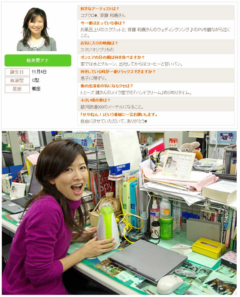 この番組が好きなんだけど、「松井愛」アナウンサーのしゃべりがうまい。てきぱきとテンポが良いし、受け答えのツボを心得ていると言いましょうか、「頭良いな」って感じです。嫌味が無いのが良い。まぁ、庶民的って言うんでしょうか?