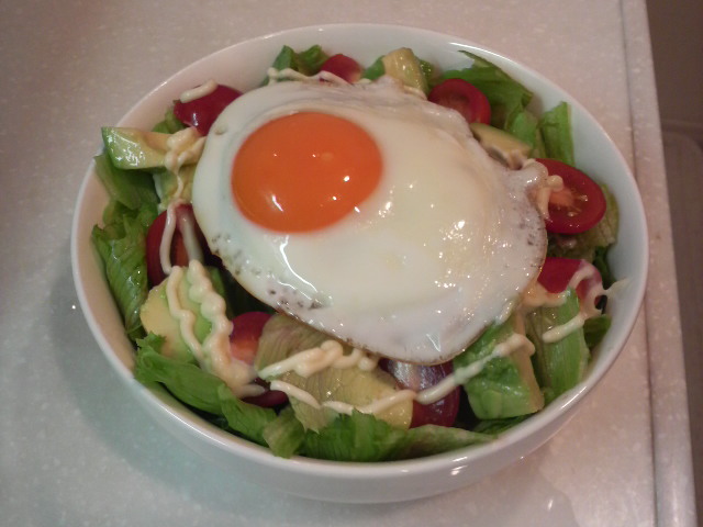 8)ご飯の上にレタス、トマト、(お好みで)アボカドをのせる。