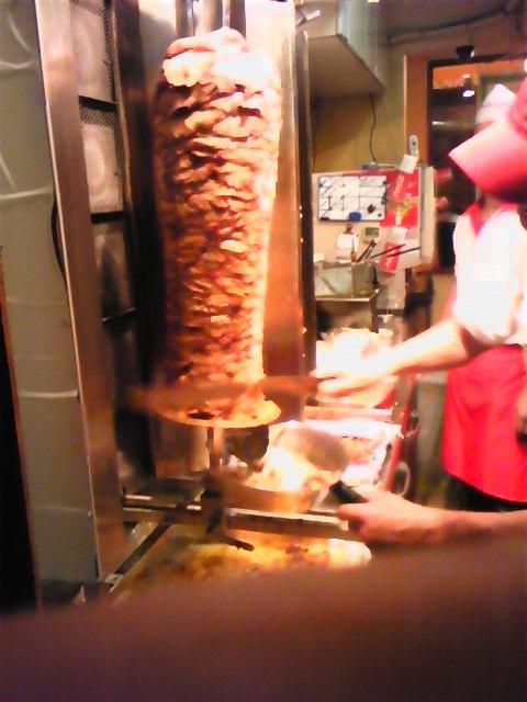 円柱状に重なった肉を長い刃物で薄くそぎとって、 パンに挟んで食います。 どこも照り焼き。 他にトルコアイスも。
