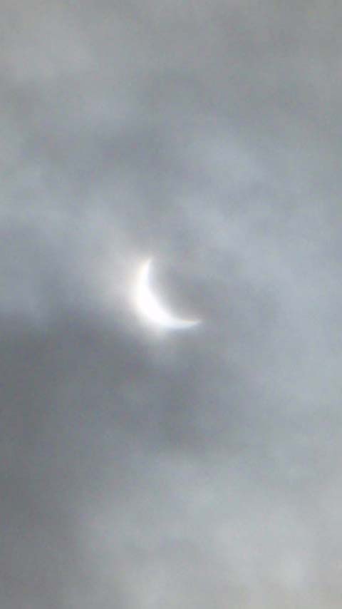 雨上がりの曇り空の中 そろそろかなと思いながらも~空は厚い雲の覆われたまま 11時近くに薄い雲の隙間から 部分日食の太陽が顔を覗かせました~☆ 数枚撮ったのですが~日食とわかる写真は一枚だけでした コンパクトデジカメで撮影したものを 携帯サイズに加工~少し拡大してみました 晴天での皆既日食を期待していたのですが~ 肉眼で見れたので好としましょう~☆