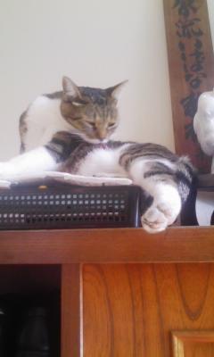 棚の上で毛繕い(^_^) 今日は暑いので家の中でマッタ~リ