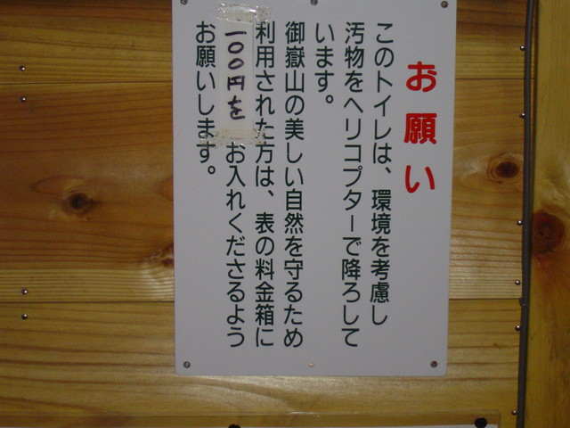 > ☆優香☆彡さん トイレの汚物をヘリコプター運んで処理しています 使用料を100円お支払いくださいと、書いてあります。 携帯の方ごめんなさいね。