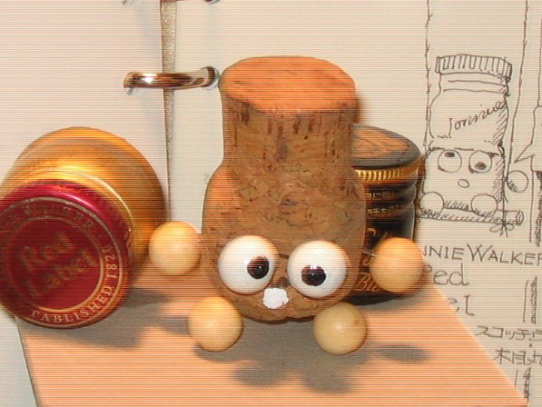 数ヶ月前に呑んだ「安シャンパン」のコルク栓に目玉を付けたのがはじまりで、その後に呑んだコルクが欅の身の周りに転がっていました。