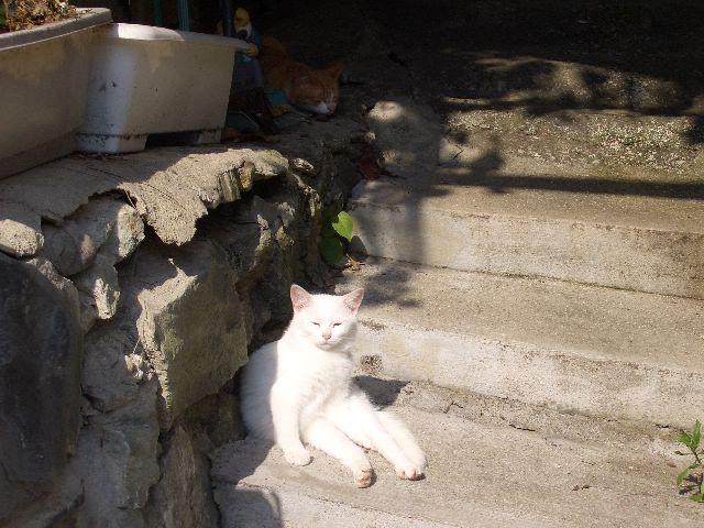 白猫がひなたぼっこしてました o(^-^)o可愛いやん 近づいてみたら、こっちに気づきました∑( ̄口 ̄)人間がおるわ 子猫もちょっと困っている…f^_^;どないしよ カメラ持っとるし、とりあえず、ポーズとらなあかんな 早よ、十夜ヶ橋に行ってな(/_;)/~~ なんて、猫は言わんか(・_・;)