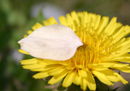 桜が散って 黄色いタンポポが草原に 青い空 日の光がいっぱいです