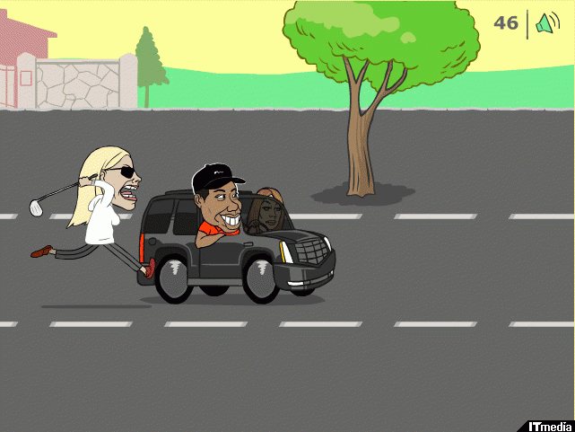 ゴルフクラブを持って追いかけてくるエリン夫人から、愛人と一緒に車で逃走するゲーム