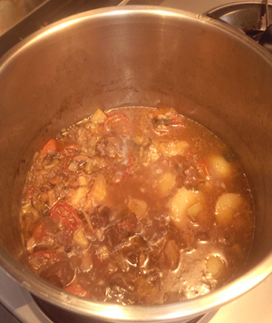 赤ワイン入れたりシチリアのドライミニトマトをお湯で戻して入れたり。