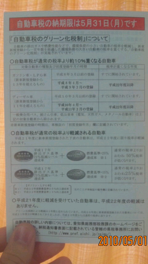 去年も払ったはずなのに。。 すっかり忘れておりました。。 自動車税納税通知書きましたーーーー。゚(PД`q。)゚。 なんで納期限は5月31日なんでしょうか。。。 34,500円ってふつーに痛いっすショボ――(´-ω-`)――ン 浪費はだめだ。。。お金節約しよう。。。 副収入が欲しいーーヽ(`Д´)ノ はぁ。。。