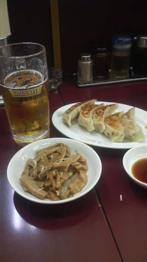 今日も 呑んでます。 メンマと餃子で(^-^) ビールが すすむ~(笑顔)