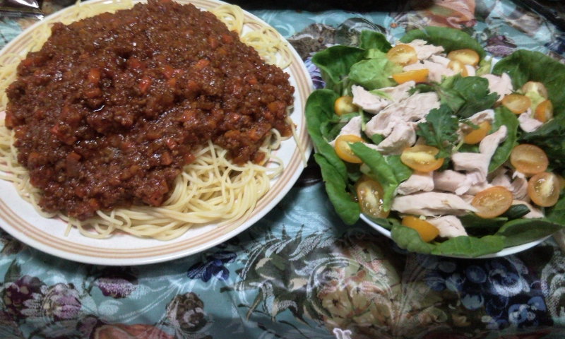 このパスタみてると、食欲がわくね。サラダは綺麗で、目でも楽しませてくれる イイ奥さんになれますよ
