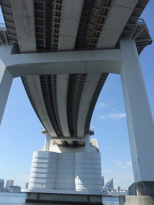 ・・・9月26日の話・・・ この日は 電車に乗って まずは 新橋。 そこから、 「ゆりかもめ線」と「水上バス」が乗り放題のチケットを買い、 『日の出駅』で降りて、 水上バスで お台場の公園に行きました。 水上バスでは、 2階に登り、海の景色を満喫しました。 レインボー・ブリッジが 間近で見られるのも 楽しみの一つでした。 私の最終目的地は「船の科学館」です。 船の科学館行きの航路は 廃止になったんだねぇ。 知らなかった。 写真は レインボー・ブリッジの裏側