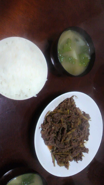 牛肉とごぼうの甘辛煮 かき菜と葱のぉ味噌汁 でしたぁ(´・ω・`)/~~