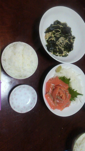 えのきとわかめの生姜炒め サーモンの刺身(´・ω・`)/~~ 今日ゎ疲れちゃった(笑)