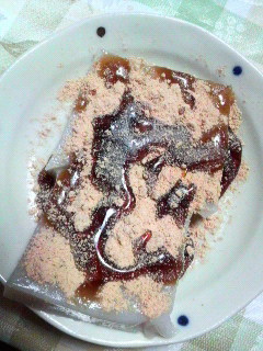 母親が日帰りで東京に行ったのでお土産に「くず餅」を買ってきてくれたので食べました ひょっとしたら黒糖シロップ&きな粉をつける順番を間違えたかも?