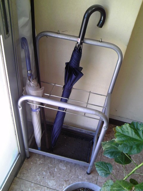 皆さんはどうなの?電車の中とか、駐輪場とか--(女性は少ないかも知れないけど)パチンコ屋とか、使用したのに出る時は完璧に晴れてた、気がついたらどこかに置き忘れ~なんて事はないですか?ごらんの通り会社の常設分、残り2本。また早めに補充だな。こういったしっかりした黒傘より、ビニ-ル傘の方がいいんだよ。たまに自転車に乗ってる時使用するから・・黒傘だと視界が遮られるからね