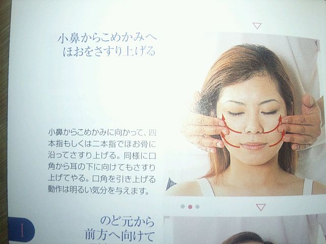 小鼻からこめかみへほおをさすり上げます。自分は基本、マッサージは擦って、揉む事はあまりしません。リンパの流れを意識してます。