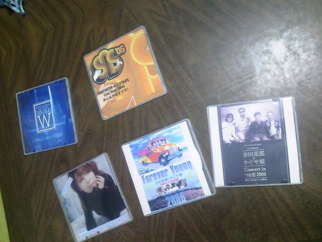 これ、やっとこさビデオからDVDへダビングが終了したものである。以前からライブビデオを数本もってたけどその名残りだったんだ。皆さんにとってはナツメロ以外何でもないんだろうけど・・ブル-表紙はチャゲアス。名古屋か何かの25周年記念ライブ。で、残りなんだけど・・マンガチックなものはサザンの年越しライブ(この年で解散したんだ。)あとは・・女性のショットになってるのはKYOKO。昔のバ-ビ-ボ-イズのヴォ-カル。(スガシカオやポルノグラフィティの姉貴分と云った方が皆さんにはわかりやすいかな?---毎夏に結成する福耳っていう臨時グル-プのヴォ-カル--)
