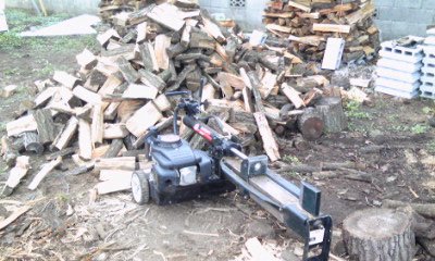 いつもはアックス(斧)で薪割りしますが、3年分くらいの原木が手に入ったので、エンジン油圧式薪割り機をレンタルして一気に割りました。