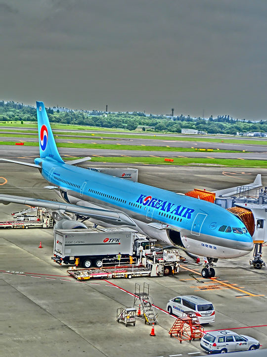成田空港の 空港ビルの最上階は、 フードコート と 展望デッキになっている。 展望デッキには 少数の飛行機マニア と、 空港に立ち寄った記念に 飛行機の離着陸を見るグループがいる。 マニアでなくても 飛行機の飛び立つ姿は 見ていて気持ちがいい。 望遠レンズじゃないから、 飛び立つシーンは 上手く撮れてない・・・。 なので、写真は 荷物を積み込む韓国の飛行機。