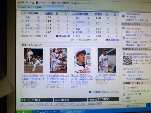 あ-巨人がつまらん。何で先週のヤクルトとの3連戦、死にもの狂いで3連勝しかありえない---肝心な時に負けるかな~?昨日勝ってもまだ5ゲ-ム差じゃん!パ・リ-グなんぞ7ゲ-ムぐらい離れてる。これじゃあソフトバンクとヤクルトで九分九厘決定でしょ。マ-クンとハンカチ王子の対決が初っていうのも意外だったけど・・・誰かあの甲子園の時の決勝憶えてますか?延長再試合の時は仕事中だったから・・ところどころワンセグで見てたにすぎないが~