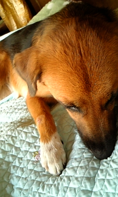 ビーグルとシェパードのミックス犬のハイジちゃんは、リカちゃんとじゃれてて噛まれてしまいました。ハイジは、猟犬の性質があるので捨て犬だったけれど、かなりきちんと犬の学校で躾られたので、本気になることはありません。でも、リカちゃんはマジになっちゃったようです。がぶってやられちゃいました。先に手を(口を)出してジャレ始めたのは、ハイジちゃんのほう。反省してるみたいです。噛まれたあとを獣医さんの所で毛を剃ってお薬つけて、包帯を巻いてもらったのにとっちゃいます。エリザベスカラーを巻いても壊すし…。頭の良い子なので簡単に外しもできる。ひとしきり傷をなめたら落ち着いたみたいです。これで、ちょっとはお部屋で暴れる事は無くなるはず(多分きっと…)あとは、リカちゃんの脱走癖が治れば平和です。でも、なかなか里親さん見つからないなぁ~。イイコ達なんだけど。。。