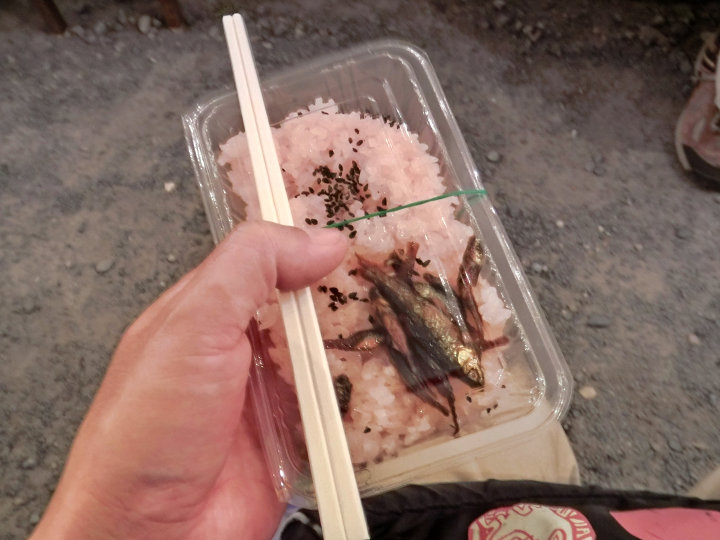 写真・・・赤飯の添え物として「小魚の佃煮」が入っている。