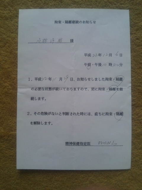 1.平成22年11月29日、お知らせしました「隔離」の必要な状態が続いておりますので、更に「隔離」を継続します。