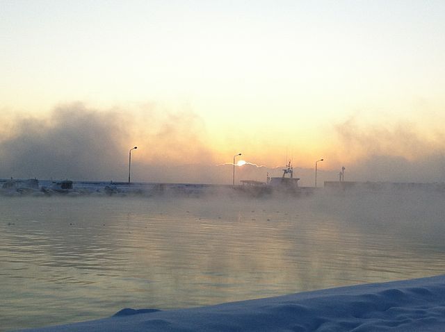二人目の利用者さんの迎え時間まで若干の空き時間があるので近くの漁港で時間を潰しますが、今朝は冷え込みが厳しかったので海面との気温差で水面から雲のようにもくもくと煙が上がります。(水蒸気ですが)