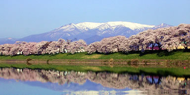 残雪の蔵王と川沿いの桜並木、最高だね~