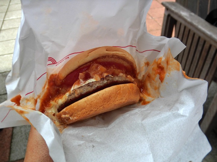 あ。 あ。 あ。 食べる前から ベタベタ・・・。 ちょっと戦意喪失。 でもなぁ、この程度の事じゃ 私は へこたれない。 だって、私は ケババーだから。 (注・ ケババー = ケバブの屋台を見ると つい買ってしまう人) 私ぐらいの 達人ケバビストになると、 あの食べづらいケバブを、 一切、手も汚さず、口も汚さずに 食べる事が可能だ。 私の実力をもってすれば、 この、ケチャップやらチーズやら ダラダラのハンバーガーを、 普通に食べても なんともないっスよ。 手 洗いに行きましたよ。