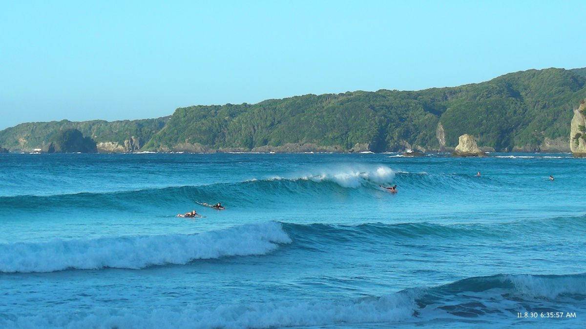 真夏の早朝の海、穏やかな海でのサーフィン、人もまだ疎らで朝焼けがきれい