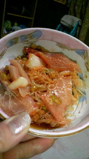 キムチ納豆大根のツマとみじン切りしたonionに刺身混ぜ混ぜ♪
