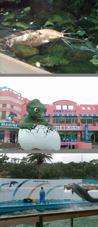 犬吠埼の灯台近くの 「犬吠埼マリンパーク」は、ヒマつぶしに入ってみたものの、 中は けっこう イイ! なんか ほのぼの。 水族館だけでも、まぁ値段ぶんは楽しめるし、 イルカのショーが見られれば、それはハッピー。 入場料は 大人1260円だけど、 銚子電鉄や灯台で もらえる割引チケットを出せば、 大人1050円で入れます。 あ? クララ? タイトルのクララ? クララはナマズの名前(品種)です。 一番 上の写真が クララ