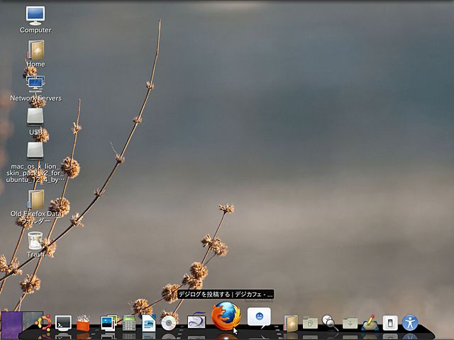 註:画像は、MacOSX風にしたデスクトップ。配布元は、ubuntu。バージョンは、12.04LTS。