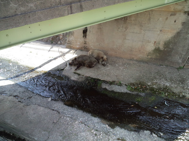 さっき駅に行く道で、男子高生が集まってるから見たら、猪夫婦のお昼寝。 「近づいてみろ」 「わ~、怖いぞ、やめる、目を覚ました」などと騒いでました。 画像は小さいけど。 ひなたは暑いから橋の下に居ました。