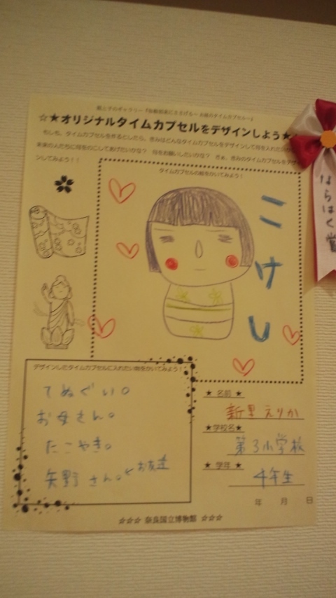 可愛い 奈良国立博物館の、プロムナードに、子供達が10年前、色んな思いを書いて、タイムカプセルにいれたのが、展示されていました。 中でも、小4の子が書いたのに、思わず笑顔になりました。 タイムカプセルに入れたかったのは、てぬぐい、たこやき、さん(友達の名)それに、お母さん たこやきを入れるのは、関西人間だけど、『お母さん』には、思わず吹き出した この女の子は、大学生かもしれない。 一度、会って感想を聞いてみたい。 どんな気持で、見たのだろうか