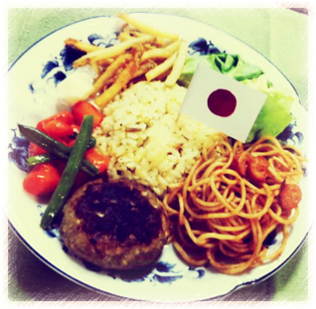 今日の夕食は お子様ランチならぬ大人様ランチ! ガーリックライス ハンバーグ ナポリタン ポテトフライ 人参といんげんのグラッセ サラダロール (おまけにチーズ) し!か!も!! 旗は手作りです(^p^)へへへ 美味しかったですよ←自画自賛w