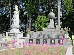 墓地の中を見渡す<守り>観音石像3mほどの