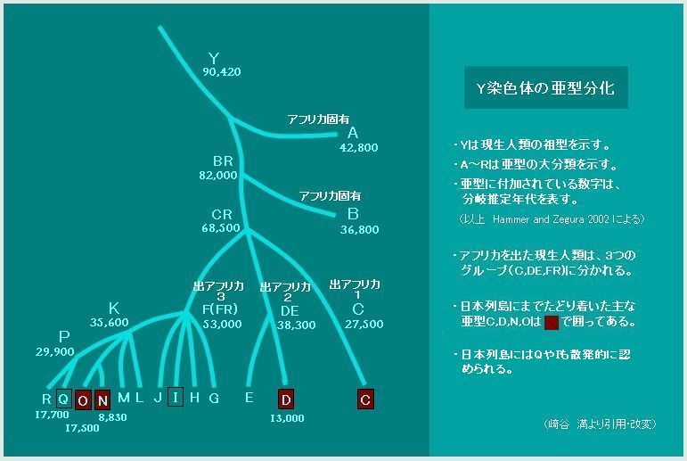 Y染色体のDNA塩基配列の国際的分類法(YCC2002)によるAからRまでの18種の大分類のうち、Alu配列と呼ばれる約300個の特定の塩基配列(YAP+因子)を持つのはDグループとEグループのみであり、DグループとEグループはおよそ5万年前に分化した近縁グループである。そのうち、Dグループが相当な頻度で存在するのは日本とチベット、インド洋のアンダマン諸島のみである(日本で30~40%、アイヌと沖縄ではさらに頻度が高く、チベットでは約30~50%)。他方、Eグループが相当な頻度で存在するのはアフリカと地中海沿いの中東からイタリア南端にかけてのみである。つまり、Y染色体にAlu配列(YAP+因子)を持つ者が相当頻度で存在する地域は、アフリカと地中海沿いの中東からイタリア南端にかけてとチベットと日本のみであり、日本人のY染色体の30~40%については、DNA塩基配列が近縁関係にあるものは周辺国等にほとんどなく、チベットやアフリカや中東のY染色体と近縁関係にある。なお北アフリカでのEグループの存在率は約75%、エチオピアのユダヤ人とされる集団でのEグループの存在率は約50%とされている(崎谷『DNAが解き明かす日本人の系譜』勉誠出版)。また、AからRまでのグループについて、アフリカ系のAB以外を大きく分けるとCグループ、DEグループ、FRグループ(FからRにかけてのグループ)に分けられるが、日本人ではC,D,O(OはFRグループに属する)で成り立っており、Cグループ、DEグループ、FRグループの非アフリカ系3大グループすべてを含む地域は世界中で日本しかないとされている。ただし、アシュケナージユダヤ人やコーヘンラインと呼ばれるユダヤ人、中東、古代オリエントに多いY染色体はEグループだけではなく、Jグループでもある。(J1、J2) J1を持つアシュケナージユダヤ人は15~20%、J1を持つコーヘンの系譜のユダヤ人は45%とされる。(Jグループは大陸を通じ日本列島近辺に来ていた形跡が伺えるが、現在において、日本人に対するY染色体の調査でJグループに属する人は見つかっておらず、D、Eグループが分かれたのも5万年前であるため、数千年前という比較的近い過去の歴史において、日本人とユダヤ人が同一の祖先をもつ可能性は遺伝子学的には無いとされている。)Y染色体ハプログループを参照