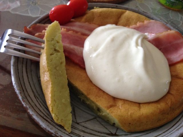 甘くない系のパンケーキで、そら豆をペースト状にした物をベースにした生地に、ほんのり焼きベーコンとアイス状のヴィシソワーズ的な物をソース代わりに乗っけるだけと言う物です。