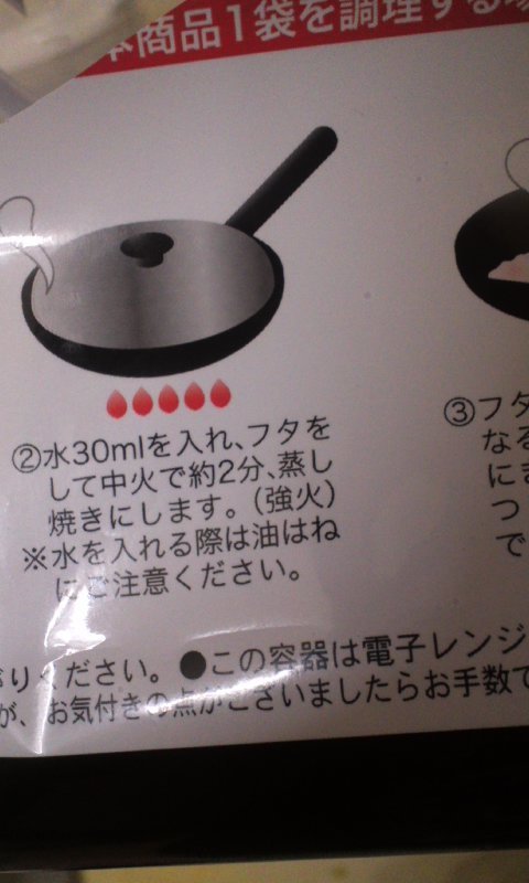 ②水を30mlを入れ、フタをして中火で約2分、蒸し焼きにします。(強火)