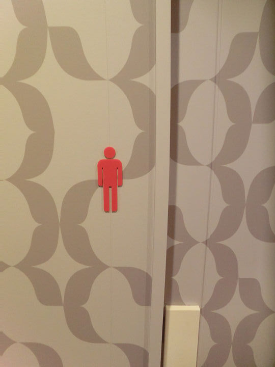 2月28日に行ったカフェ。 (ペッパー君が居たカフェ) たまたま2月28日がリニューアル・オープンの日だった。 だからもう、すごく洒落た内装になってた。 トイレの表示も無いから 店員に聞いて トイレに行った。 トイレの直前も オシャレ。 というか 分かりづらい。 「トイレ」とか「WC」とか「化粧室」とか「紳士用」とか「男子」とか そういう表示は無かった。 ちなみに、男性用も女性用も マークの色が赤だった。