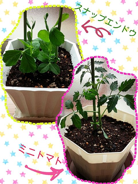 スナップエンドウとミニトマト植え替え完了♪♪ 昨日は、急遽でかけてたからねえ(∩´∀`∩) ちっちゃくてかわいい(//∇//)