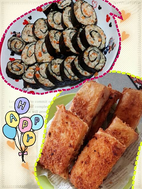 やぱ、料理だいすきだあ(*´∀`*)ノ でも、作りすぎるとゅ~(笑) 昨日の昼間は、カレーパンつくった☆ 春巻きの皮で巻いて揚げてるから、パリパリで重くないよ♪♪ 冷めてもずーっとパリパリ☆☆ 夜は、鶏挽き肉と人参と玉ねぎともやしを混ぜて海苔で巻いて焼くだけの簡単おかず♪♪ めんつゆ入ってるから、何もつけなくてもおいしいょ☆☆ 今日は、カレーパンの中身余ってるから、カレーグラタンにしようかなあ♪♪