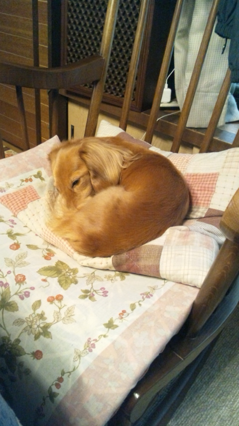 大人しく丸くなって寝ています(^^;)自分のおうちに入っていたり、私のお腹に乗ったりしてゆっくり過ごしているようです♪写真は、ロッキングチェアの座布団の上に丸くなって寝ているエリーです(^^)お腹に乗ってくれると湯タンポみたいであったかいです☆